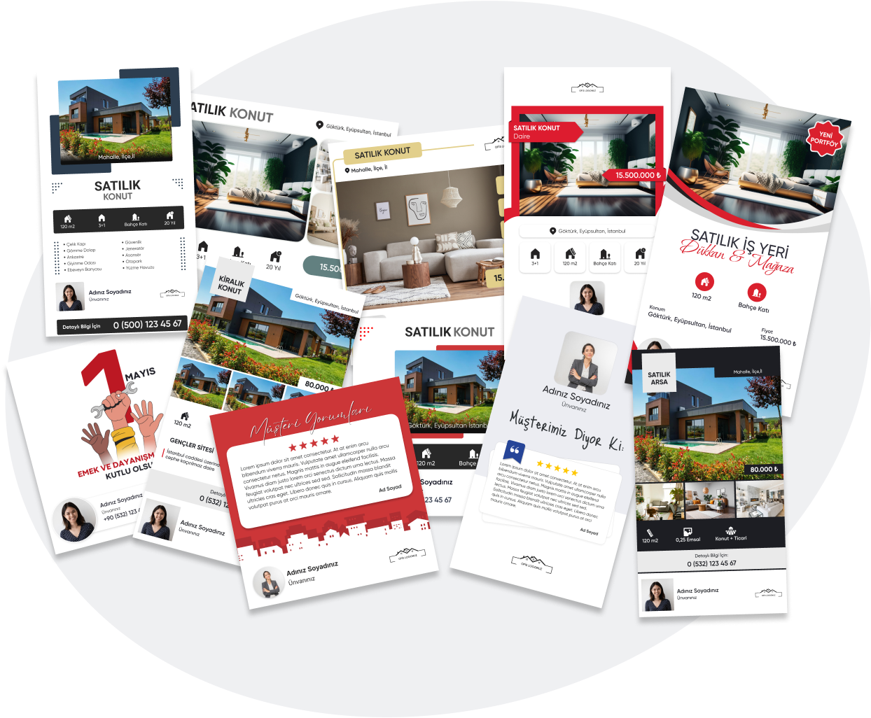 Portföy Tanıtımı, Müşteri Yorumları, Kişisel Tanıtım, Mesleki Bilgilendirme ve Özel Günler başlıkları altında sayısız tasarımdan dilediğini seç, saniyeler içinde sosyal medya paylaşımın hazır olsun!