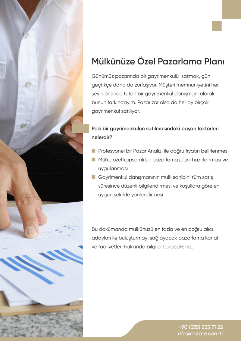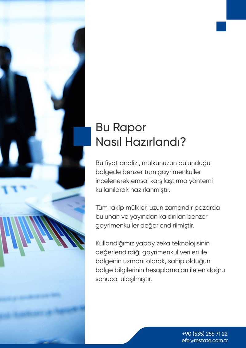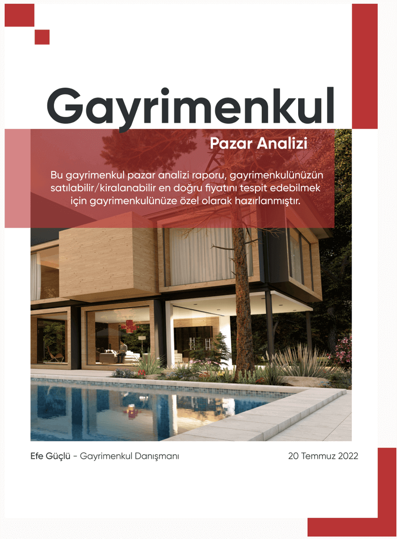 Revy'nin Pazar Analizi Raporu ile dakikalar içerisinde bir mülkün piyasa değerini öğrenin. Kendi isminiz ve markanızla, seçtiğiniz mülkün hem detaylı emsal analizini oluşturun hem de Pazarlama planınızı ekleyin. Revy'nin size sunduğu muhteşem raporu oluşturun, müşterinize gönderin, kolayca portföy alın. Hem de rapor sınırı olmadan kendi marka ve isminizle !